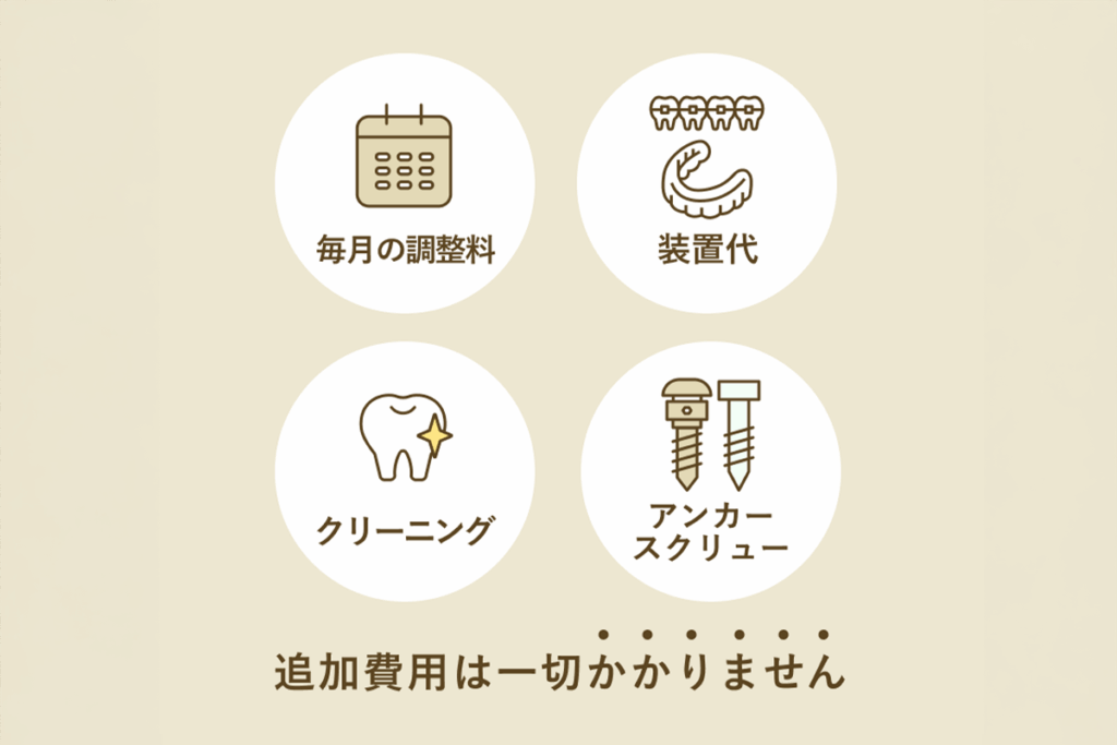 追加費用のない明確な設定なので、毎回の通院費用を気にすことなく安心して矯正治療を始めていただけます。