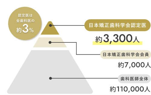 約10万人いる歯科医師のうち、「日本矯正歯科学会認定医」の資格を持つ歯科医師は3,300名(2025年3月時点)に限られています。これは、歯科医師全体のわずか約3.3%にあたります。